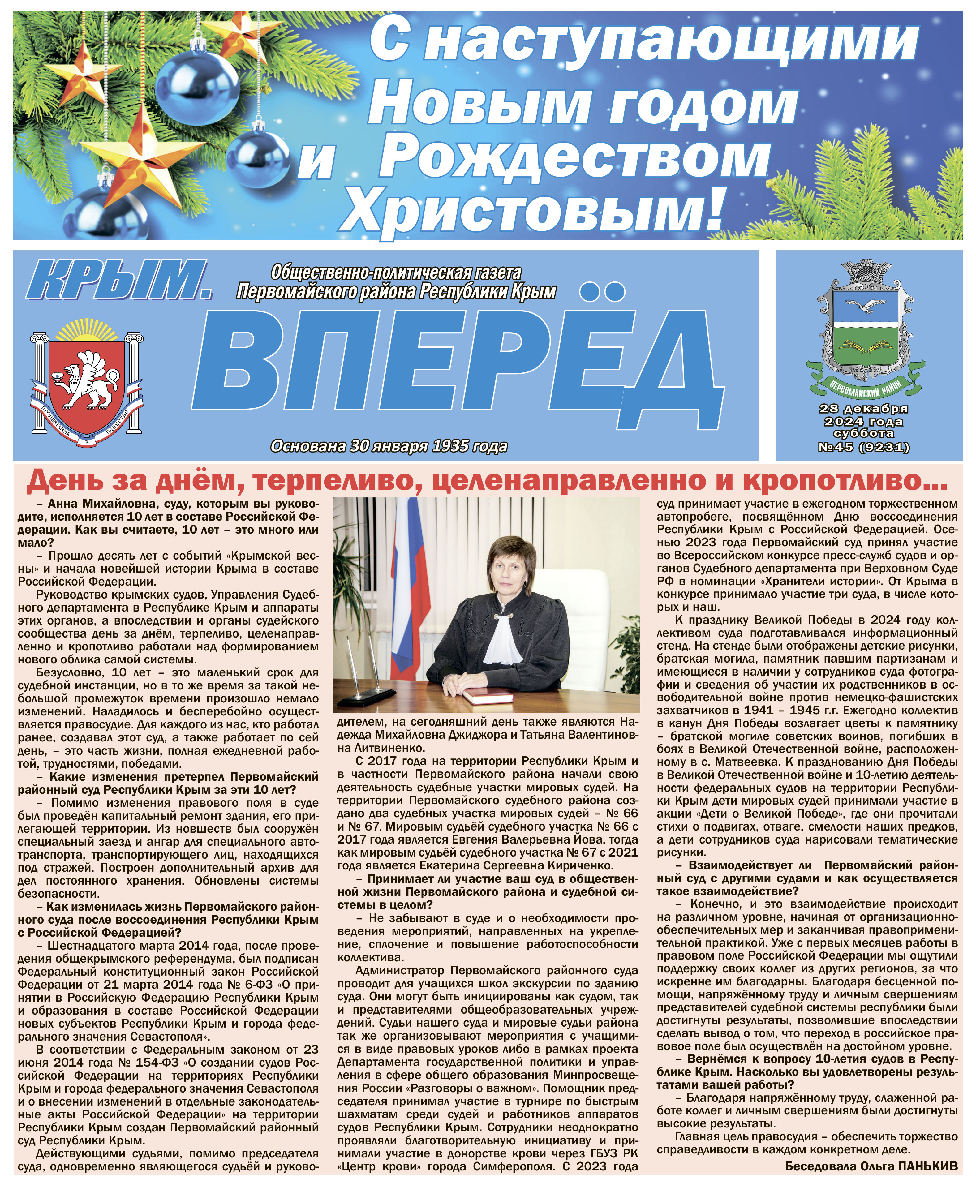 | "Крым Вперед": интервью с председателем Первомайского районного суда Анной Климовой, 28.12.2024 | версия для печати |