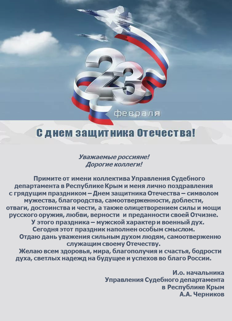 Поздравление и.о. начальника Управления Судебного департамента в Республике Крым Черникова А.А. с Днем защитника Отечества