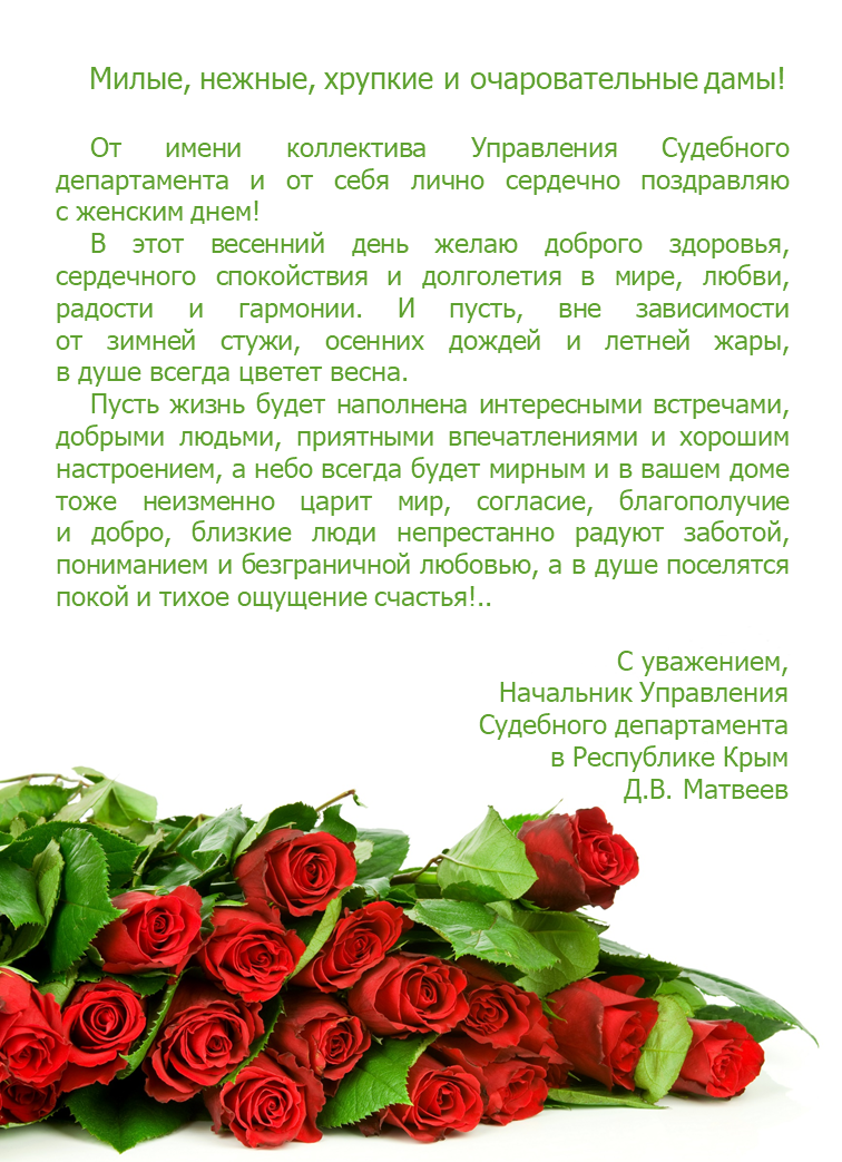Поздравление начальника Управления Судебного департамента в Республике Крым Матвеева Д.В. с Международным женским днем