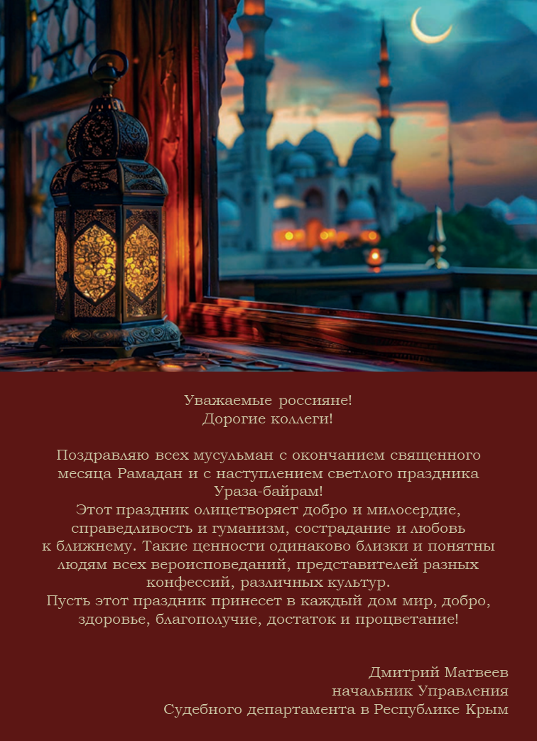 Поздравление начальника Управления Судебного департамента в Республике Крым мусульманам с Ураза-байрам