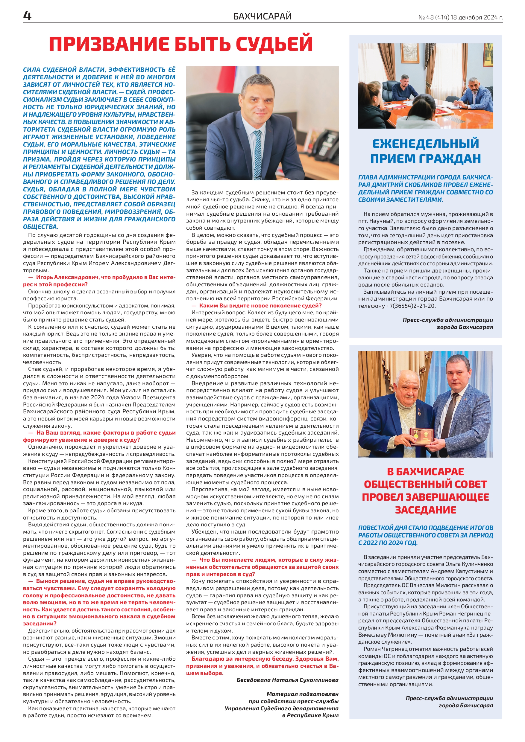 | "Новый Бахчисарай": интервью с председателем Бахчисарайского районного суда Игорем Дегтяревым, 18.12.2024 | версия для печати |